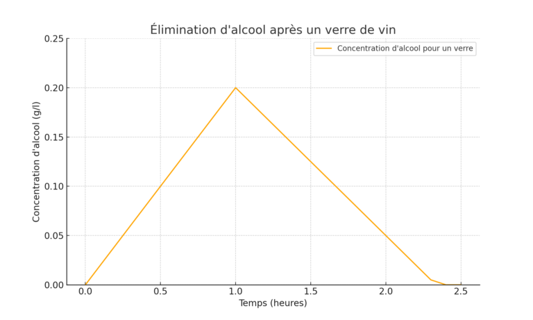 Si vous consommez donc 1 verre de vin en magnant, vous ajoutez 0,2g/l d’alcool au bout de 1h et il vous faudra +/-1h30 supplémentaires (1,5 x 0,15g/l par heure) après ce pic pour revenir à un taux de 0.