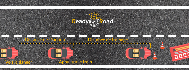 Entre le moment où le véhicule devant vous freine et le moment où vous appuyer sur le frein à votre tour, il y a ce qu’un appelle un temps de réaction. (un temps pendant lequel votre cerveau analyse ce qu’il se passe, ce qu’il doit faire et faire l’action)